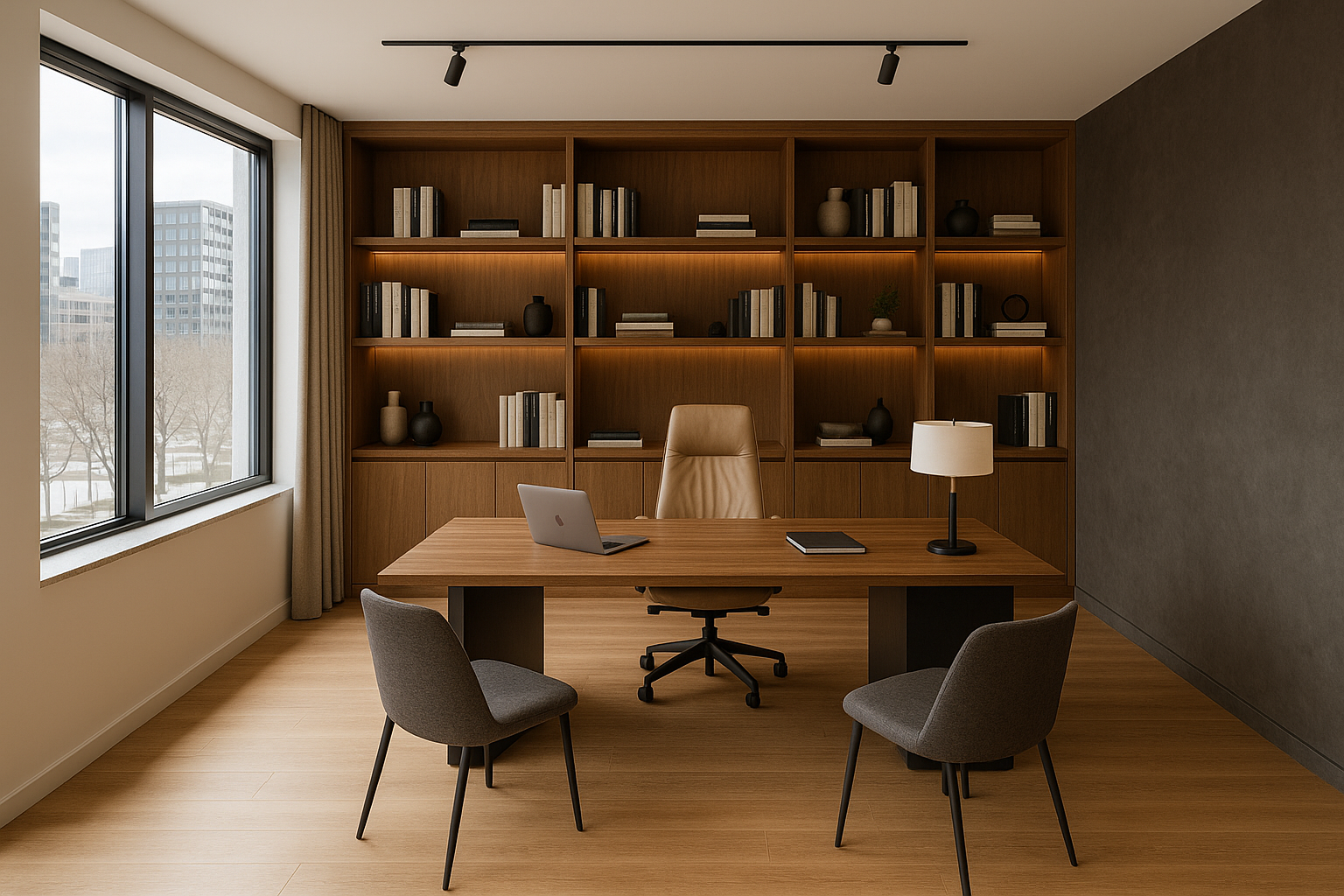 Ankara’nın kalbinde yer alan bu hukuk bürosu, profesyonellik ve güven duygusunu modern çizgilerle birleştiren özgün bir iç tasarım anlayışıyla hayata geçirildi. Mekânın genel konsepti, koyu ahşap dokuların ve gri tonların zarif uyumuyla şekillendirildi. Geniş cam paneller, doğal ışığın içeri süzülmesini sağlayarak ferah ve prestijli bir atmosfer oluşturuyor. Bekleme alanında kullanılan sade mobilyalar, minimal ama etkileyici bir düzen yaratırken; çalışma odalarında akustik konfor ve fonksiyonellik ön planda tutuldu. Tüm detaylar, hem çalışanların verimliliğini hem de müvekkillerin güven hissini güçlendirecek biçimde tasarlandı.